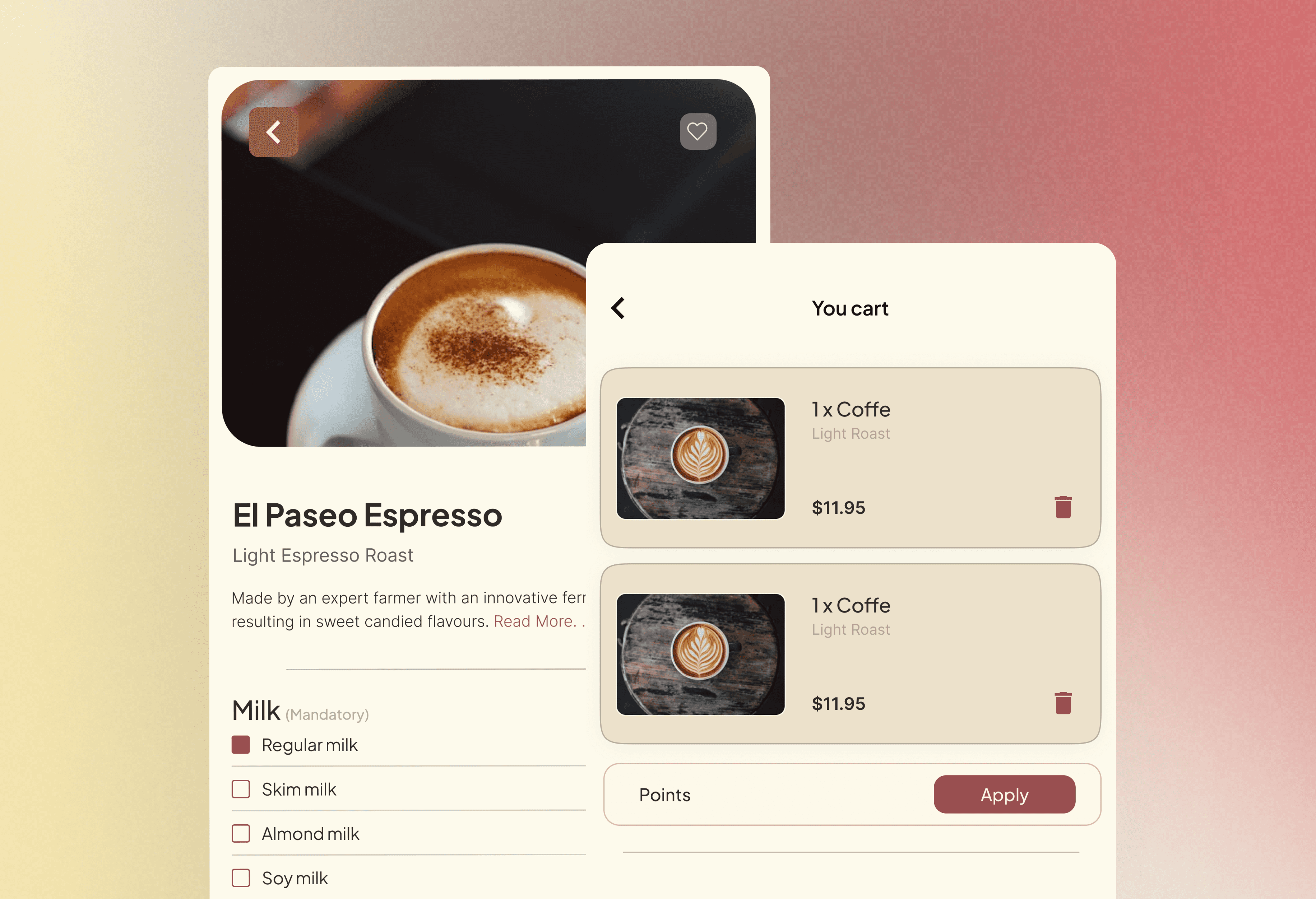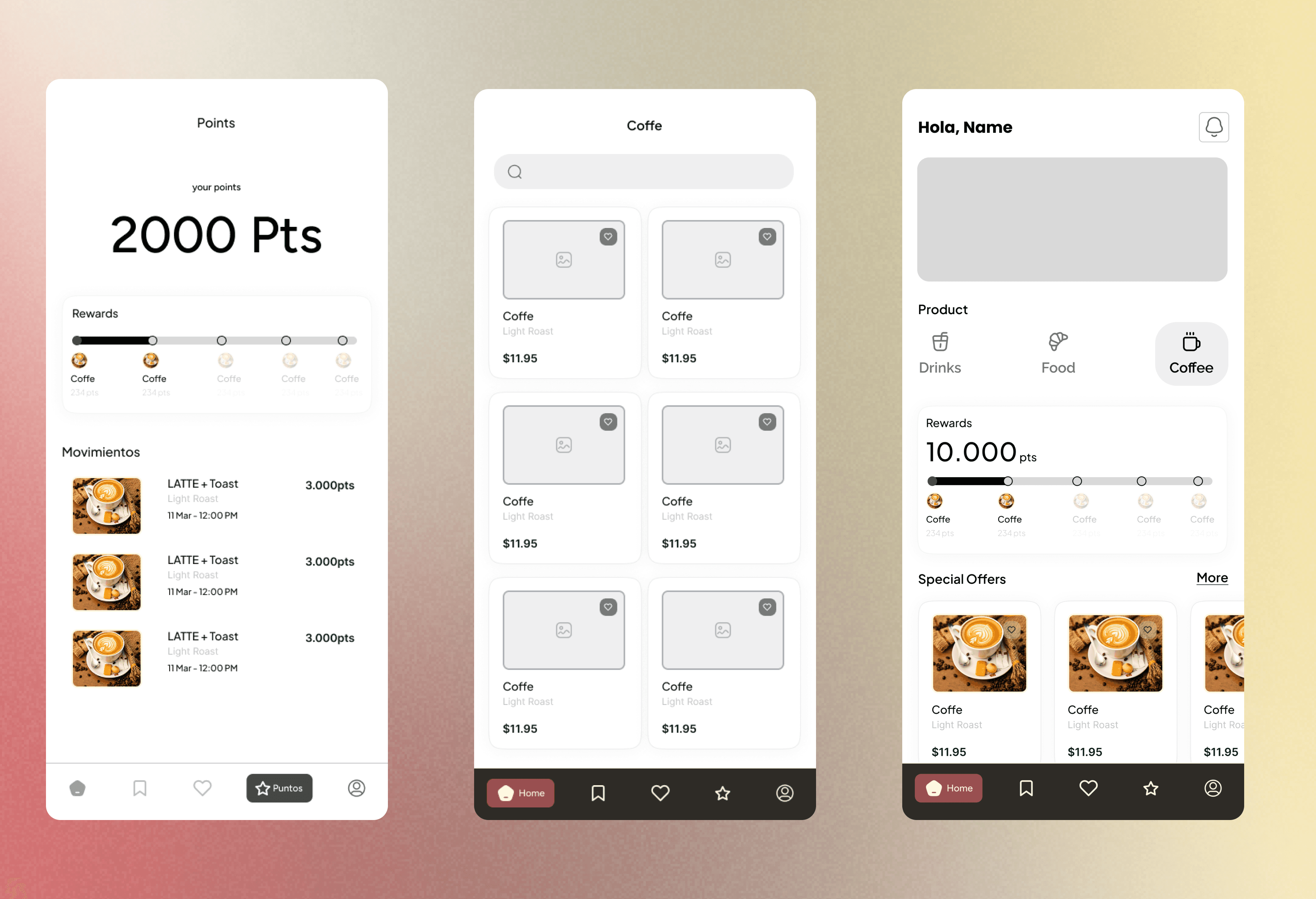Mi proceso de diseño se centró en la simplicidad y la eficiencia. Investigación y Benchmarking: Analicé las apps de pedidos de café líderes para identificar patrones de éxito y puntos de fricción comunes. Arquitectura de Información (AI): Diseñé un flujo de usuario que priorizaba el pedido rápido: Home > Seleccionar Café > Personalizar > Pagar. Diseño del Sistema de Lealtad: Creé una experiencia gamificada y visualmente clara para ver y canjear puntos, asegurando que el proceso fuera intuitivo. Wireframing y Prototipado: Desarrollé wireframes de baja fidelidad para definir la estructura y pasé a prototipos interactivos de alta fidelidad para testear la usabilidad con usuarios reales y validar el proceso de pedido y el canje de puntos. El resultado fue una interfaz limpia, enfocada en la fotografía del producto y con un checkout de solo tres pasos.